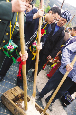 黔西南州委書記陳鳴明(中)與布依族同胞在活動(dòng)現(xiàn)場(chǎng)打糍粑