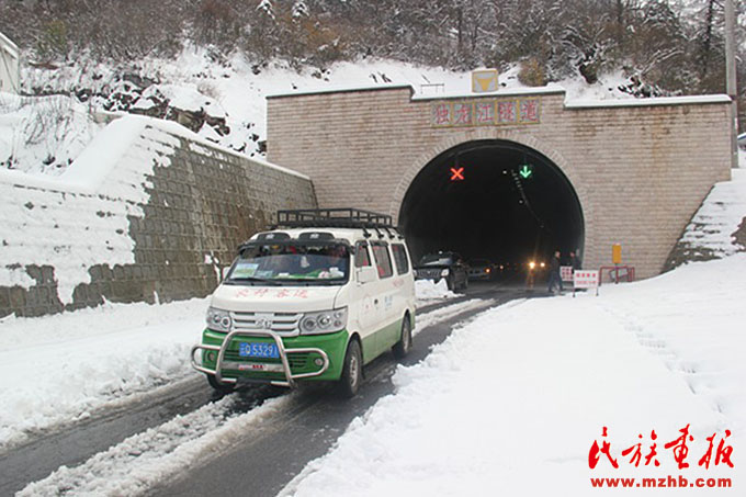 2014年4月獨龍江公路高黎貢山隧道貫通,農(nóng)村客運車輛在鋪滿雪花的路上駛進駛出