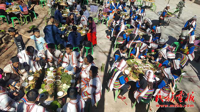 “過去過節(jié),手頭拮據(jù),經(jīng)常是三五戶人家湊錢殺一頭豬。由于物質(zhì)匱乏,節(jié)日前,男女老幼都上山挖野菜,殺豬當(dāng)天,到地里砍芭蕉花,帶上柴火去寨老家里煮年飯吃,節(jié)日第三天去寨老家唱歌跳舞?!?記者聆聽著87歲基諾族老人周白講述基諾山寨的回憶。如今的他已是四世同堂,在耄耋之年能享受天倫之樂,過上幸福生活,他心存感激。節(jié)日當(dāng)天老人們在村委會聚餐,席間接受年輕人的敬酒與祝福,其樂融融。