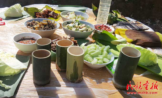 基諾族地區(qū)食材豐富,一日三餐,以大米為日常主食,雜以玉米、瓜豆等。每年5—9月的雨季,基諾山漫山遍野是食材,山藥、水芹菜、竹筍、魚腥草及各種菌類等無污染且很新鮮,是難得的烹飪材料,經(jīng)過簡單處理就成為餐桌上的美味佳肴?;Z族民間有句俗話,叫“漢炒、傣蘸、基諾舂”,也就是說漢族人喜歡吃炒菜,傣族的菜喜歡蘸著調(diào)料吃,基諾族的菜則以臼舂為主?;Z族的肉類的吃法較多,可以腌成干巴,也可吃新鮮的。酸腌魚、涼拌茶也是基諾族的最愛,基諾人做飯就餐均在竹樓二層的火塘周圍進(jìn)行,有一定的禮節(jié)和講究?;Z族吃飯時,主人首先要在火塘東側(cè)獻(xiàn)一點(diǎn)飯菜祭祀祖先和灶神,吃飯時全家人按順序在火塘旁圍蔑桌而坐,家長正對火塘,客人靠火塘而坐。