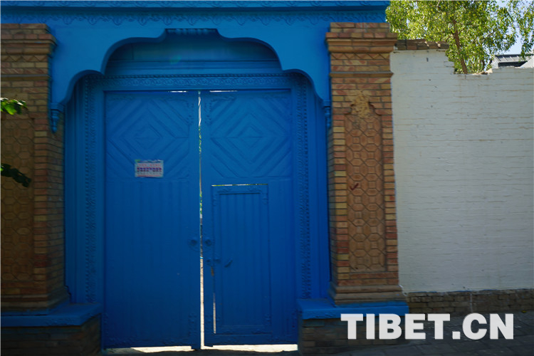 目前,喀贊其仍保留著一定數(shù)量的文物古跡,包括自治區(qū)級文物保護單位1個(陜西回族大寺),市級文物保護單位7個,另有12處清真寺建筑。圖為具有當(dāng)?shù)靥厣呐R街藍(lán)色大門。