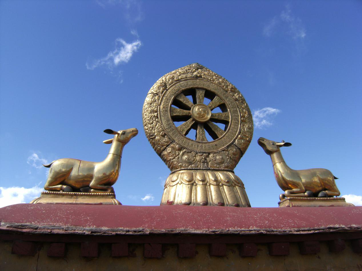 全寺坐東朝西,建筑具唐代風(fēng)格,有高四層的銅質(zhì)鎦金樓閣五座、殿堂數(shù)十間。正殿供奉文成公主從長安帶往的釋迦牟尼像,像前擺放十二盞金燈。各殿有松贊干布、文成公主、墀尊公主的塑像及佛像、祖師塑像,還有壁畫眾多。珍藏有七世紀(jì)以來的歷代文物。