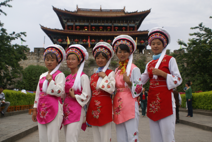 一直以來,享有“金花”美譽(yù)的白族婦女的服飾,更是色澤鮮美、絢麗多彩。大理一帶的婦女多穿白上衣、紅坎肩或是淺藍(lán)色上衣配絲絨黑坎肩,右衽結(jié)紐處掛“三須”“五須”的銀飾,腰間系有繡花飄帶,下著藍(lán)色寬褲,腳穿繡花的“白潔鞋”。手上多半戴紐絲銀鐲、戒指。已婚婦女梳發(fā)髻,未婚少女則垂辮或盤辮于頂,有的則用紅頭繩纏繞著發(fā)辮下的花頭巾,露出側(cè)邊飄動的雪白纓穗,點染出白族少女頭飾和發(fā)型所特有的風(fēng)韻。劍川一帶的年輕女子則又喜戴小帽或“魚尾帽”。洱源西山及保山地區(qū)的白族婦女常束發(fā)于頂,上插銀管,再以黑布包頭,穿右襟圓領(lǐng)長衣,系繡花腰帶,衣袖和褲腳喜鑲繡各色寬窄不同的花邊,有的還喜束護(hù)腿,顯得十分勻稱協(xié)調(diào)和俊俏美觀。總之,各地白族的服飾雖呈現(xiàn)出某些地區(qū)性的差異,但都色彩明快、映襯協(xié)調(diào)、挑繡精美、古雅端莊。