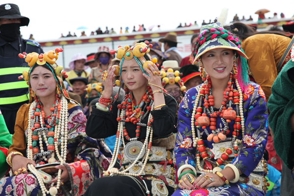甘、青、川的藏族男子非常講究腰飾,有財力的男子一般都有一條鑲有僅、銀、玉的寬皮腰帶,腰帶上還掛有裝飾性的小刀、火鐮等。青海玉樹地區(qū)的婦女裝追求華麗,內(nèi)衣外袍色彩艷麗,綢緞腰帶留長飄帶,頭、頸、發(fā)、腕、指和腰佩有金、銀、玉、珊瑚、瑪瑙等珍貴飾品,一套豪華女裝價格不菲。因此有諺語:“男人的財富系在腰上,女人的嫁妝穿在身上”之說。云南藏區(qū)的女裝上身穿長袖彩綢衫,外著無袖大襟長袍,長袍領(lǐng)口、襟邊和下擺鑲有錦緞,色彩艷麗。云南一些藏區(qū)的女子喜歡穿百褶裙,顯示出女性的優(yōu)美身材。西藏工布地區(qū)的女裝顯得簡約,先穿有袖內(nèi)衣,再將氆氌拚縫成大片,中間挖一圓口,穿時將頭伸進圓口兩端垂與胸背,再束腰帶即可。藏族婦女的頭飾也很多,有碎辮的、有戴頭巾的,有盤發(fā)的,西藏山南地區(qū)的巴珠最有特點。巴珠是三枝狀,平系于頭頂兩枝向前,將分梳的兩條發(fā)辮分別盤于兩枝上。其上部還有一弓形物,與三枝狀兩端連接,上系絲織品,邊緣鑲珍珠、珊瑚等。女子13歲戴巴珠,象征已經(jīng)成人。金邊帽也很有特色,藏區(qū)的男女都戴。帽型為桶狀,周邊鑲織錦,內(nèi)有四片耳片,兩大兩小,天冷時放下耳片護耳。狐皮帽形似倒掛的金鐘花,以布作底層,再縫上狐貍皮,帽后有兩條長飄帶。男帽稍高,女帽較低。