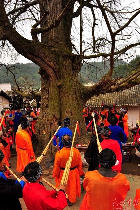 苗族寨老引領眾人來到寨中央的千年銀杏樹下進行祭樹,寨老高舉牛角、男人們吹起蘆笙圍著古樹轉圈,司儀唱起“古歌”祈禱。寧堅攝影,引自民族畫報