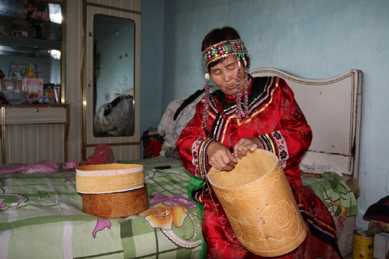 鄂倫春族素有“白樺民族”之稱,白樺樹皮制品種類非常多,大到可以乘人載物的樺皮船、圍蓋“仙人柱”的“鐵克沙”,小到可以裝在衣兜里的煙盒和含在口中的狍哨,提水用的桶、采集用的簍、裝物用的箱、盛飯用的盆、吃飯用的碗、喝酒用的蠱等等。樺樹皮制品的裝飾圖案可以通過(guò)壓劃、壓印(點(diǎn)刺)、剔刻、烙燙、補(bǔ)花、繪畫等多種方法形成。壓印點(diǎn)刺是最常用的裝飾手段,工具是用獸骨制成的,分單齒、雙齒、多齒和簡(jiǎn)單幾何形幾種。先在剪裁好的器物材料上,用壓、打等方法點(diǎn)刺出裝飾紋樣,再縫合成器物成品。這種裝飾多為素面凹形花紋,顯得樸實(shí)單純,而且器物越陳舊樺皮顏色越深,越有光澤,圖紋越清晰。也有人在壓打線上著色,這便形成了另一種風(fēng)格,美觀艷麗而且突出了物象特征。