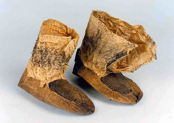 魚皮靴俗稱魚皮靰鞡,由魚皮四周整體向上折起,抽褶向上形成底部,前面與鞋臉縫制在一起,形成半圓形,鞋口再用另一塊魚皮縫上,形成圓筒形靴靿,然后穿繩或皮條做鞋帶。此鞋由身、臉、黝三部分組成。魚皮鞋既結實保暖,又抗寒防水防滑,適于在冰上和泥濘道路上行走及從事漁獵生產。如圖所示。