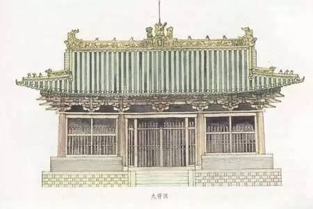 根據(jù)資料與記載,廡殿頂屋頂早在殷商時(shí)代就已出現(xiàn)。不過,現(xiàn)在對(duì)唐代中期以前的廡殿式屋頂?shù)木唧w結(jié)構(gòu)已無從得知,晚唐以后漸有實(shí)例可查。其形象是屋面平緩,正脊較短。正脊兩端為鴟尾而不是鴟首。