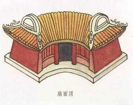 扇面頂和萬字頂一樣,是一種非常別致的屋頂形式,扇面頂顧名思義,就是扇面形狀的屋頂形式,其最大特點(diǎn)就是前后檐線呈弧形,弧線一般是前短后長(zhǎng),即建筑的后檐大于前檐。建筑的西山墻的墻線若向內(nèi)延伸,可以交于一點(diǎn),而這一點(diǎn)就是扇形的扇子柄端。扇面頂?shù)膬啥丝梢宰龀尚?、懸山,也可做成卷棚形式。扇面頂一般都用在形體較小的建筑中,會(huì)讓建筑看起來更為小巧可愛。