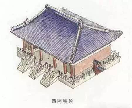 四阿殿頂也就是廡殿頂。四阿殿頂也是宋式叫法。“阿”是建筑屋頂?shù)那?,“四阿”就是四面坡式的曲檐屋頂。廡殿頂共有五條脊、四面坡,所以叫做四阿殿頂。