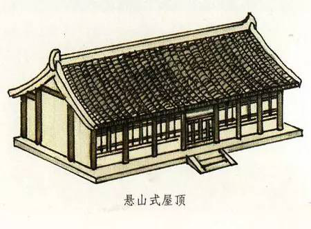 懸山式屋頂與硬山式屋頂一樣有一條正脊和四條垂脊。不過,它又有不同于硬山式屋頂那樣與山墻平齊,而是伸出山墻之外。這部分伸出山墻之外的屋頂是由下面伸出的桁(檁)承托的。所以懸山式屋頂不僅有前后出檐,在兩側(cè)山墻上也有出檐。懸山式是兩面坡屋頂?shù)脑缙谧龇?,不過中國(guó)古代的重要建筑基本沒有使用懸山式屋頂?shù)?,特別是唐代以前尤為少見。