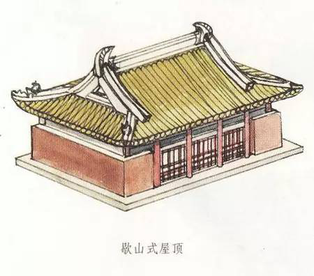 歇山是清式叫法,在清代之前它又有曹殿、漢殿、廈兩頭造等不同名稱。歇山式屋頂在具體形式上又有最基本形式的單檐歇山頂,以及變化形式的二層、三層或多層屋頂?shù)闹亻苄巾?,還有最上面的屋頂可以不設(shè)正脊而形成卷棚式的卷棚式歇山頂?shù)榷喾N形式。
