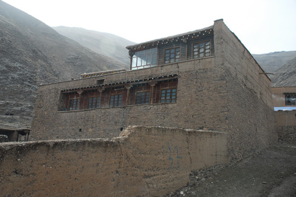 “碉院”則是一組較大的綜合性建筑,一般三層,局部四層,平面為四全院式,中間有較大的天井內院,設小花壇,可種樹木花卉。內院四周設回廊,石砌外墻用全封閉,除了門洞,墻上開少量小窗。底層為牲畜圈、雜用房;二層多為倉庫、接待房、傭工房等;三層為臥室、廚房和糧倉、珍寶庫;四層為經堂、佛堂、經書庫。有的在外墻女兒墻部分刷以黑色或棕色圓珠圖案,窗上檐一層或二層方椽挑出,作為傳統(tǒng)式藏窗形式,豐富了立面,改變了石墻面之笨拙感。