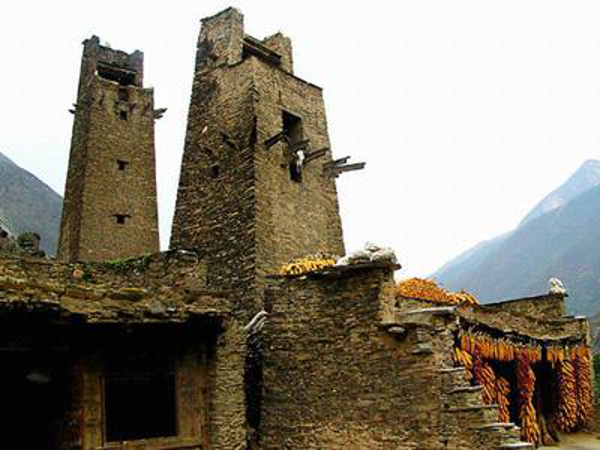 在羌語中,碉樓被稱為“邛籠”,意為美麗、高貴的房子,早在2000年前《后漢書·西南夷傳》就有羌族人“依山居止,壘石為屋,高者至十余丈”的記載。碉樓的高度在十米至三十米之間,用于御敵、貯存糧食和柴草。碉樓有四角、六角、八角幾形式,有的高達(dá)十三四層。建筑材料是石片和黃泥土,墻基深1.35米,以石片砌成。石墻內(nèi)側(cè)與地面垂直,外側(cè)由下而上向內(nèi)稍傾斜。修建時(shí)不繪圖、吊線、柱架支撐,全憑高超的技藝與經(jīng)驗(yàn)。建筑穩(wěn)固牢靠,經(jīng)久不衰。自唐朝來,羌族人民因各種原因向西北遷移,到了西藏和青海,所以現(xiàn)在,羌族碉樓也往往被稱為藏族碉樓。