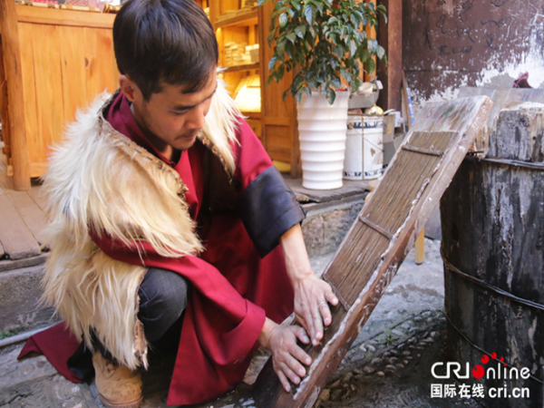 納西族男子楊慧杰展示東巴紙的造紙過(guò)程