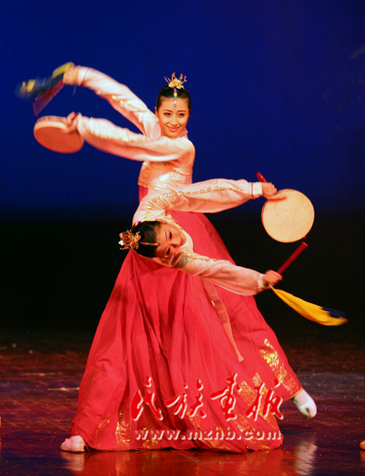 長(zhǎng)鼓舞和象帽舞其實(shí)都源于傳統(tǒng)的農(nóng)樂(lè)舞。早先,長(zhǎng)鼓舞是農(nóng)樂(lè)舞的一個(gè)部分,20世紀(jì)初,由于其獨(dú)特的舞蹈形態(tài),長(zhǎng)鼓舞從農(nóng)樂(lè)舞中脫穎而出,成為一種獨(dú)立的民間舞蹈,備受朝鮮族群眾的喜愛。舞臺(tái)上,那腰掛火紅長(zhǎng)鼓的姑娘一道明媚的眼神、一個(gè)華麗的轉(zhuǎn)身,都引得觀者癡癡凝望;那一陣緊似一陣、一聲響似一聲的敲擊,聲聲清脆,直撞你的心房,令你目眩神迷、心旌搖蕩!