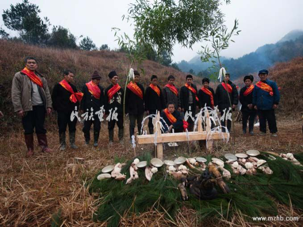 到招龍儀式活動(dòng)點(diǎn)時(shí),已是凌晨五點(diǎn)半,我們所在的位置是一個(gè)山腰,有一個(gè)小壩子。我發(fā)現(xiàn)參加儀式的只有十二三個(gè)人,就好奇地問(wèn):“為什么只來(lái)十多個(gè)人?”原來(lái)這些人是選出來(lái)的代表,該村有7個(gè)村民小組,共203戶(hù),有980多人口,每次招龍大喜時(shí),要從村民中推選出12位作為招龍代表,從頭到尾主持一切事務(wù)。說(shuō)話(huà)間,村里人就開(kāi)始忙著生火,或準(zhǔn)備各項(xiàng)招龍工作。他們用木板支起一個(gè)擺放祭品的臺(tái)板,擺上祭品。接著,在招龍師傅的主持下,儀式正式開(kāi)始。第一個(gè)程序是“喊白虎龍”,苗家稱(chēng)為“共階夸羊捌”,師傅拿著一個(gè)白公雞,進(jìn)行一番念誦后宰殺掉,等雞煮熟后再擺上祭臺(tái)。