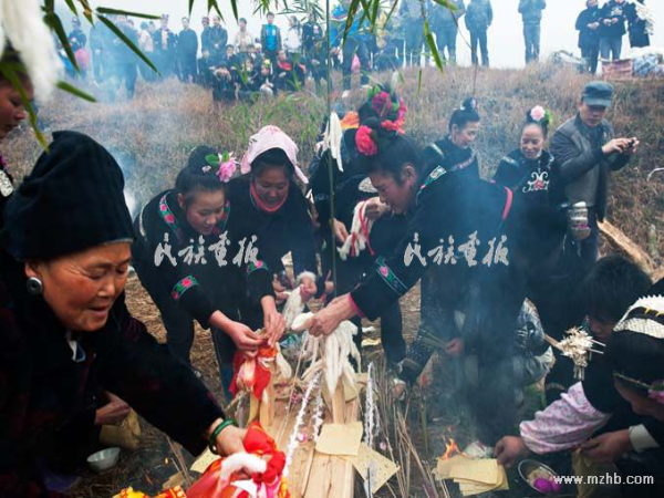 祭祀現(xiàn)場(chǎng)穿著盛裝的姑娘跟著歡樂(lè)的蘆笙起舞