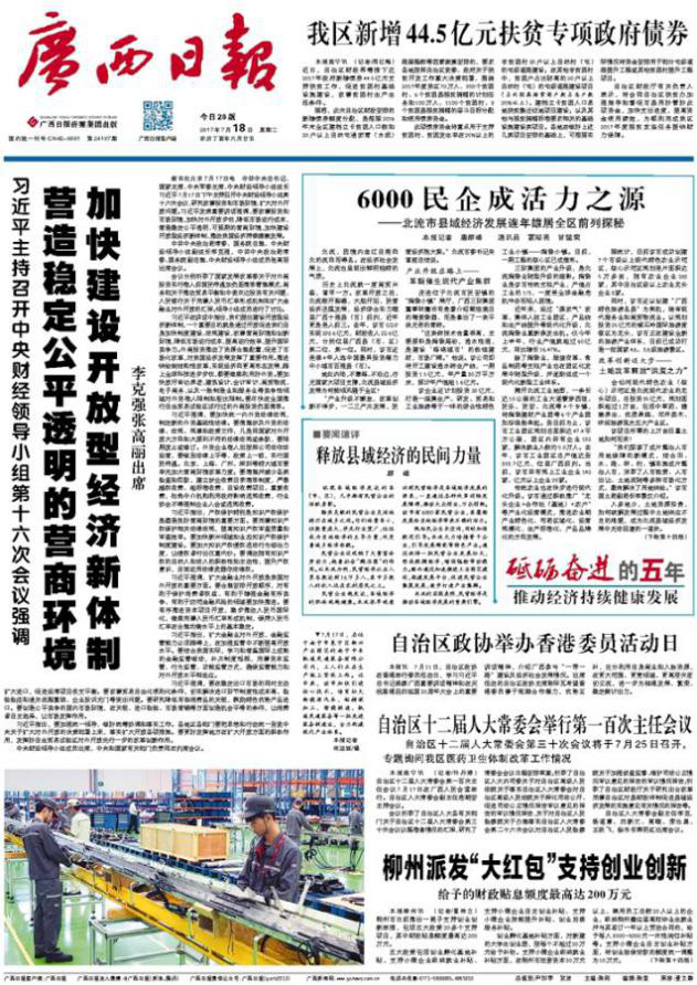 《廣西日報》立足廣西、面向全國,國內(nèi)外公開發(fā)行。目前,星期一至星期五每日出版對開12版,星期六、星期日出版對開8版,彩色印刷,是廣西第一大綜合性日報。新聞信息容量大,專刊副刊多樣,適應(yīng)多層次讀者需要,集指導(dǎo)性、權(quán)威性、科學(xué)性、服務(wù)性、實用性、知識性和趣味性為一體。
