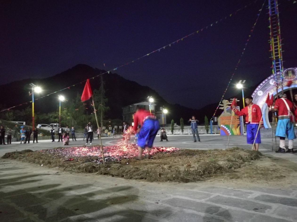 上刀山、下火海,是傈僳族民間的傳統(tǒng)民俗活動,是其傳統(tǒng)節(jié)日“刀桿節(jié)”上的主要表演項目。傈僳族的“刀桿節(jié)”源于一種原始的宗教活動。早期在“刀桿節(jié)”上表演上刀山、下火海的勇士們,都得聽命于巫師。上刀山、下火海之前,有一套繁瑣的宗教祭祀儀式。而且每個上刀山、下火海的勇士身上都要掛上幾十條巫師畫的符咒,使這一活動蒙上了濃厚的宗教色彩。經(jīng)過改革的傈僳族的“刀桿節(jié)”,一般于每年二月初八舉行,屆時,上刀山、下火海就是表演的重要內(nèi)容。上刀山之前,人們首先豎起兩根20 多米長的筆直的松樹桿。在樹桿之間順序捆上36 或72 把鋒利的刀刃向上的鋼刀作梯子。表演開始后,表演者赤手光腳,蹬上梯子頂端,并要做些“蜻蜓倒立”“飛燕迎春”等高難動作。下了刀桿后,勇士們還要赤裸著上身、光著腳跳入熊熊烈火中,甚至用身體滾壓火海,直至炭火逐漸熄滅為止。此后,群眾性的娛樂活動就開始了,唱歌跳舞,呈現(xiàn)出節(jié)日的歡樂氣氛。上刀山、下火海,是經(jīng)過表演者長期的武術(shù)和氣功訓(xùn)練才能完成的。這一活動也表現(xiàn)出傈僳族人民機智、勇敢、知難而進(jìn)的優(yōu)良品質(zhì)。
