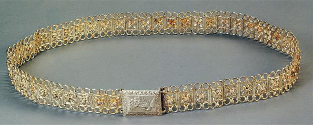 傣族銀腰帶傣族婦女喜歡帶手鐲、戒指、耳墜、項(xiàng)鏈等,這些物飾金質(zhì)、銀質(zhì)、玉石均可,仿制品也行。女嬰生下來幾天,就由家長用消過毒的針為娃娃扎耳,為帶耳環(huán)作準(zhǔn)備。對(duì)女性而言,銀腰帶更是不可缺少之物,腰帶上飾以孔雀、蓮花等各種花型。女人們認(rèn)為銀腰帶越寬就越美(圖為傣族銀腰帶,以上圖片為中央民族大學(xué)博物館館藏)。