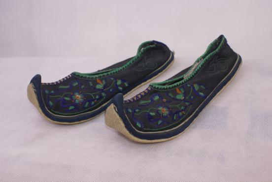 壯族花鞋是壯族的刺繡工藝之一,又稱“繡鞋”,為婦女所用,流行于廣西龍州等地。鞋頭有鉤,象龍船。分有后跟和無(wú)后跟兩種。鞋底較厚。針?lè)ㄓ旋R針、拖針、混針、盤針、堆繡、壓繡等。在色彩上,年輕人喜用亮底起白花,常用石榴紅、深紅、青黃、綠等艷麗色,紋樣有龍鳳、雙獅滾球、蝶花、雀等;老年人多用黑色、淺紅、深紅等厚色,紋樣有云、龍、天地、獅獸等。