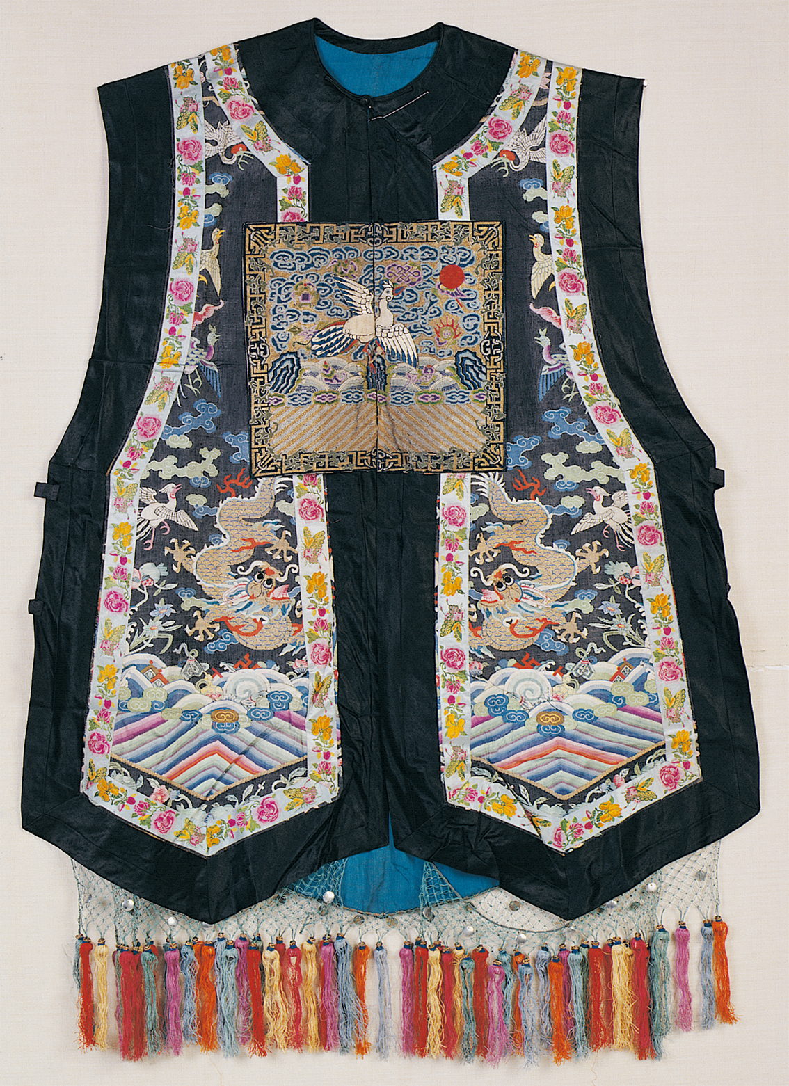 《史記·五帝本紀(jì)》載:“黃帝之前,未有衣裳屋宇。及黃帝造屋宇,制衣服,營殯葬,萬民故免存亡之難。”在五千多年前的新石器時代仰韶文化時期,可能就產(chǎn)生了原始的農(nóng)業(yè)和紡織業(yè),開始用織成的麻布來做衣服。據(jù)傳,黃帝之妻嫘祖發(fā)明了飼蠶和絲紡,衣冠服飾基本成制。殷商西周,冠服制度逐漸完善,春秋戰(zhàn)國時期,衣冠款式走向多元,冠服制被納入“禮治”范疇,從此漢族衣冠服制更加詳備。中原地區(qū)還出現(xiàn)了胡服戎裝,甚至相沿成風(fēng)(圖為漢族清代七品文官女朝褂,中央民族大學(xué)民族博物館館藏)。