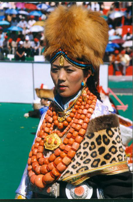 藏族婦女發(fā)飾因地域之別而顯得豐富多彩。西藏部分地方的婦女喜戴巴珠,拉薩附近的婦女所戴三角形巴珠,平系與頭頂,兩枝向前,將分梳的兩條發(fā)辮分別盤在兩枝上。日喀則、江孜一帶的婦女戴弓形巴珠,弓背向上,梳成多條的發(fā)辮分別掛在弓的兩端。貴重的巴珠上面鑲有珊瑚、瑪瑙等,顯得富麗堂皇。姑娘一戴巴珠,就意為著長大成人,因此,第一次戴巴珠時(shí),家中要為姑娘舉行傳統(tǒng)的成人儀式。