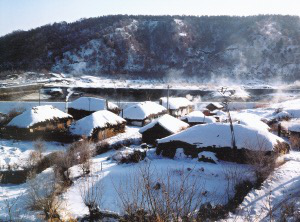 朝鮮族聚居的長白山區(qū),山巒起伏,河流縱橫,村落都是背山面水,房屋坐北朝南。村落的大小主要是依開墾耕地的多少而建,街道依山勢自然形成,東西方向較長,村屯之間以稻田相連。