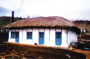 水稻的大面積種植提供了充足的稻草,它們可用于紡草繩、苫屋頂。因此,苫蓋稻草的屋頂也是朝鮮族民居的特色。四面墻壁很薄,中間立木柱,兩面釘薄板或綁扎秫秸,以草泥抹平,刷白灰。每個窗、門兩側(cè)依木柱成框,并刷藍色,后墻只留一門,不設(shè)窗。間壁墻上架柁,柁上搭檁木、鋪椽子,再鋪秫秸,鏝一層黃泥,即成屋頂。從屋頂四周。