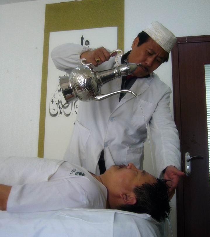湯瓶八診療法,包括頭診、耳診、面診、手診、腳診、骨診、脈診、氣診八種療法,與現(xiàn)代經(jīng)絡(luò)學(xué)有相同的哲學(xué)思想。因人而異,運用不同的經(jīng)脈、竅穴診療。它主要是依據(jù)回族醫(yī)學(xué)基本理論,運用湯瓶水浴、末稍經(jīng)絡(luò)根傳法、放血、刮痧、火罐等湯瓶的基本手法,并結(jié)合穆斯林視為神圣的“杜阿伊”,分別作用于受施者身體的不同部位,操作者通過受施者的各種反應(yīng),即可判斷疾病之所在,進(jìn)而調(diào)整施術(shù)的治療手法、輕重程度和次序頻率等,從而使受施者達(dá)到提高免疫機(jī)能、防病治病的目的。