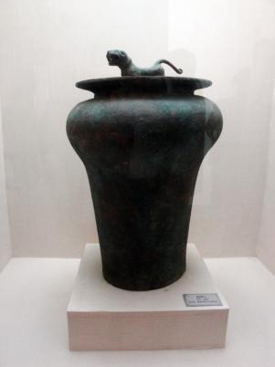 為巴文化最具代表性的青銅樂器,高68cm,上徑36cm,底徑28cm,重30公斤。1989年夏,萬州甘寧鄉(xiāng)發(fā)大水,錞于從紅旗水庫泄洪道巨石縫中被發(fā)現(xiàn),由萬州博物館收藏。2005年6月,調(diào)集到重慶中國三峽博物館。這件錞于屬戰(zhàn)國晚期的巴人作品,其通體完整,音質(zhì)優(yōu)良,造型厚重,形體特大,有“錞于王”之譽(yù)。其上部的鈕作虎形,栩栩如生,不怒而威,虎腿以漩紋勾畫出神物特征,是巴人虎崇拜的又一重要例證?;⑩o的周圍,分布著五組“圖語”:椎髻人面、羽人擊鼓與獨木舟、魚與勾連云紋、手心紋、神鳥與四蒂紋。這些圖語對研究巴文化是極為重要的資料,其中羽人擊鼓與獨木舟已經(jīng)被選取為重慶中國三峽博物館外墻浮雕的中心圖案(戰(zhàn)國青銅虎鈕錞于圖片由老鐵提供)。