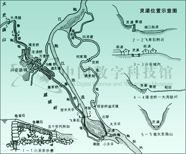 靈渠,又名零渠。以其曾部分利用靈(零)河水系的原有河道,故名。因開鑿于秦,一名秦鑿渠。又因位于今廣西興安縣城附近,故近代或稱之為興安運河。靈渠是一條連接湘江與漓江的人工渠道,主要由鏵嘴、大小天平石堤、南渠和北渠等工程構成。鏵嘴是修建在湘江中的分水壩,用巨石疊砌而成,前銳后鈍,形似犁鏵,這是引湘入漓的關鍵工程,它有效地使湘江一分為二,一支順南渠入漓江,一支沿北渠回流入湘江。南、北渠總長三十四公里,是靈渠的主體結構,是貫穿湘、漓二水的通道。在鏵嘴尾端還筑有“∧”字的大小天平石堤,起著蓄水、溢洪,調劑水量的作用,能保證整個工程發(fā)揮正常的效益。