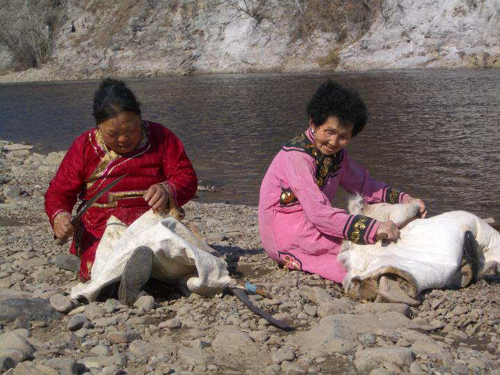 鄂倫春人過去在家庭公社“烏力鄰”里,同生產(chǎn)共消費,在當(dāng)時生產(chǎn)力十分低下的情況下,憑著扎槍和弓箭,單個人很難獲得能夠滿足衣食需要的獵物,必須要有“烏力鄰”全體成員的通力合作,才能戰(zhàn)勝兇猛和龐大的野獸,所以,在“塔坦達(dá)”領(lǐng)導(dǎo)下的集體狩獵是當(dāng)時最主要的勞動形式。隨著生產(chǎn)力的不斷發(fā)展和個體小家庭的大量流動,不僅社會組織“烏力鄰”由原來血緣性的家庭公社演變?yōu)榈鼐壭缘牡赜蚬?,勞動組織也隨之發(fā)生了極大的變化。集體狩獵已不再是“烏力鄰”傾巢出動,而是由幾個小家庭的成員自愿結(jié)合成“安嘎”來進(jìn)行。同時還出現(xiàn)了集體和個人等多種勞動形式。狩獵也不再單純是為了滿足衣食的需要,剩余獵物可以拿去交換,獵產(chǎn)品已趨于商品化。故此時一些珍貴的細(xì)毛皮張和藥用價值較高的獸類,成了鄂倫春人主要的狩獵目標(biāo)。這樣就形成了一年中的四個狩獵旺季,即:農(nóng)歷正月至2月是“鹿胎期”;4月至6月是“鹿茸期”;9月至落雪為“叫鹿尾期”;落雪后至來年開春是“打皮子期”。大概是源于原始的圍獵,鄂倫春人把狩獵叫“打圍”,而這四個狩獵旺季就叫“紅圍期”?!凹t圍期”除“叫鹿尾期”外,都組織“安嘎”集體出獵。“安嘎”是一種臨時性的狩獵組織,狩獵旺季將臨時,由一人發(fā)起,串聯(lián)幾位親朋好友或志趣相投的人組成一個“安嘎”,待獵期結(jié)束,“安嘎”自行解散,下次出獵時再重新組合,因此其成員并不是固定的(圖為熟化狍皮,吳雅芝攝影)。