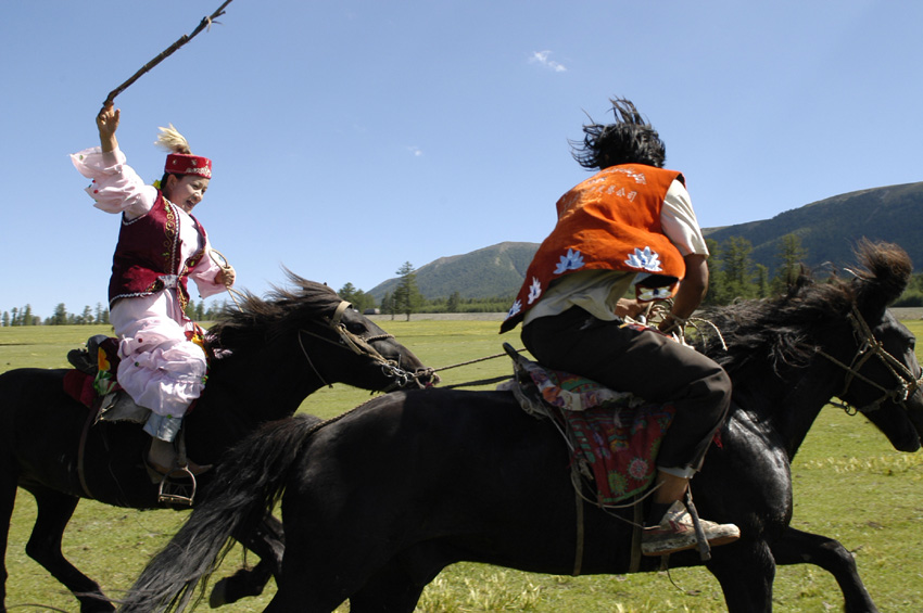 賽馬也是哈薩克人十分喜愛的一項傳統(tǒng)民族體育活動。賽馬分為賽走馬和賽奔馬兩種形式。賽走馬就是比馬的速度、耐力以及穩(wěn)健,騎手一般都是成年人。比賽時,不僅要使馬走得快、穩(wěn)、美,而且還不能使馬跑起來。賽奔馬就是比馬的速度和耐力,都是以先到達終點為勝。