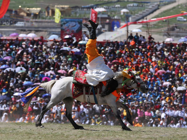 馬上運動驚險刺激,是藏族人民非常喜歡的運動,每當舉行賽馬活動,親朋好友都要前去助陣,得勝者都有獎勵,親戚朋友還要為得勝的主人和馬披紅掛彩。