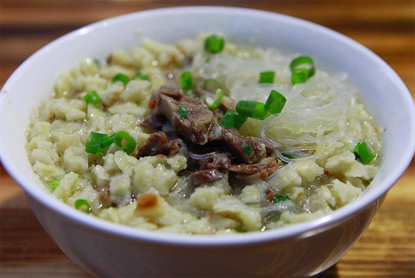 饃掰好后,請(qǐng)伙計(jì)呈給掌勺大廚,加羊肉湯大火快煮,加牛羊肉、粉絲、蔥花、蒜苗、香菜,優(yōu)質(zhì)的還有木耳、黃花菜和香干等即可端上來(lái)吃了。這樣一大碗自己親手掰好的泡饃,翠綠的蔥花、蒜苗、香菜、紅褐色的牛羊肉、黃色的金針菜、映襯著潔白晶瑩的粉絲、黝黑的木耳、香味四溢,。還應(yīng)注意的是:端上來(lái)的泡饃應(yīng)是泡饃墊底,粉絲覆成網(wǎng)形,佐以蔥花、香菜、牛羊肉擺成魚形在最上面,吃時(shí)左手拿勺,右手執(zhí)筷。泡饃上桌后,把辣子醬鋪在上面,切忌攪動(dòng),講究從一邊“蠶食”,以保持鮮味。糖蒜用否,個(gè)人自愿。餐后飲用一小碗原汁烹制而成的高湯,以為清口。
