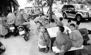 小和尚們拿到自己的那份“朵薩拉”,和自己的家人、朋友到緬寺的后院里拆看。然后,根據(jù)上面所寫找到賧奉的人,自己或請(qǐng)朋友把上面所寫的祝詞念誦一遍。賧奉的人會(huì)虔誠地跪著聽完祝詞,然后畢恭畢敬、心甘情愿地把賧奉的物品舉過頭頂,遞給來人拿走。賧奉的物品根據(jù)各家的經(jīng)濟(jì)情況而定。拿玉波家來說,就是一個(gè)小塑料蘿里放著一包方便面,一根火腿腸,一瓶娃哈哈酸奶,兩塊旺旺餅,一個(gè)蘋果,兩個(gè)桔子,還有一張新嶄嶄的5元人民幣用小棍子夾著插在中間,像面旗子。和尚們將這些賧物拿回家,與家人和親戚分享。那錢是不會(huì)用的,放在家里,就會(huì)吃不完,用不盡。因?yàn)檫@是賧奉給佛祖的東西,誰沾了都會(huì)有福。