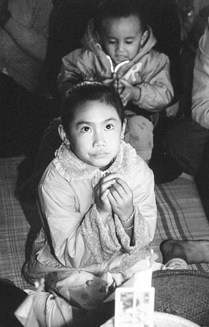 這時(shí),走來一個(gè)大佛爺和兩個(gè)老人,因?yàn)榉鹱娌粫?huì)開口說話,他們是來替佛祖給玉波念“薩拉帥”祝詞的。先由大佛爺念了一段《祝福經(jīng)》,給玉波滴了水,然后兩個(gè)老人打開玉波那寬半尺、長足有7米多的“薩拉帥”祝詞。玉金說,這祝詞是請(qǐng)曼降村的前大佛爺康朗寫的(康朗:指佛爺還俗的人)。來倆個(gè)老人念,是考慮到可以換著念。玉波的奶奶也想到了玉波可能跪不習(xí)慣,就帶來了墊子,讓玉波或跪或坐,因?yàn)槟钔曜T~要兩三個(gè)小時(shí)。祝詞的內(nèi)容大致是這樣的:“我是一個(gè)在菩提樹下長大的女孩,在佛祖的護(hù)蔭下,臉長得像菩提樹葉一樣又嫩又青,身材像檳榔樹一樣苗條好看,心像金鹿一樣善良。當(dāng)我年滿12歲以后,人世間的喜樂情愛,貧窮苦難就會(huì)來到我的面前。今天在父母的幫助下,我準(zhǔn)備了這些物品來賧給佛祖。我千祈禱萬祈求,希望佛祖保佑我織布是行家,丈夫種田是能手。命里見火能親,遇水能溶。生的孩子女的長得像一只蜜蜂,男的長得像一頭水牛,用他們的勤勞贍養(yǎng)雙親。從小就聽話,自幼就很乖。在母親的懷里不亂哭,在父親的背上不亂搓……”