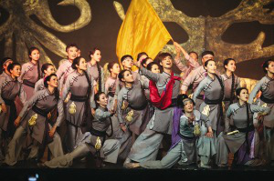 《遙遠(yuǎn)的察布查爾》以沈陽錫伯族同胞西遷新疆屯墾戍邊的史實為創(chuàng)作素材,融合了音樂、歌劇、舞蹈、雜技等多種藝術(shù)形式。全劇分為五大篇章。第一章《家鄉(xiāng)如天堂》,描繪了錫伯族在廣袤的呼倫貝爾大草原、豐饒的遼東大地建設(shè)自己的家園,他們狩獵、捕魚、耕作的生活景象;第二章《奉詔別鄉(xiāng)》,講述了錫伯族官兵奉清廷之命前往遙遠(yuǎn)的伊犁戍邊駐防,族人們用特有的薩滿爬刀梯的形式祈禱,祝福遠(yuǎn)行的親人一路平安;第三章《大西遷》,展現(xiàn)了艱辛的西遷路程;第四章《戈壁開大渠》,表現(xiàn)了堅強的錫伯族人面對惡劣的自然環(huán)境,開掘大渠,引來滾流不息的生命之水;第五章《戍邊屯墾再創(chuàng)天堂》,講述了新疆錫伯族人不但在金戈鐵馬的歲月中保存了自己的文化,還將滿語、滿文完好地傳承至今,創(chuàng)造了一個個人間奇跡。