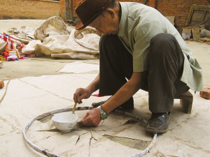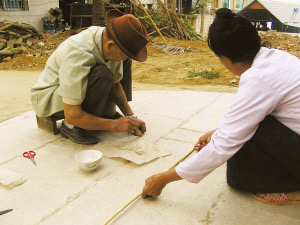 言談間,巖妞把制好的竹環(huán)放入早已畫(huà)好的同心圓圖案中的小圓上,只見(jiàn)竹環(huán)大小正好與小圓吻合。巖妞說(shuō),圖案外側(cè)的大圓便是擺放棉紙用的。接著,他把手中厚厚的幾張棉紙圍繞著已經(jīng)放入圖案中的竹環(huán)依次擺入,直至擺滿(mǎn)。在同心圓圖案的上側(cè),巖妞還畫(huà)了一個(gè)寬與同心圓圖案的直徑相符的矩形圖案,把棉紙鋪滿(mǎn)其中。巖妞說(shuō),這圖形就是“貢菲”的高度。制作的最后一道程序,是把棉紙用漿糊粘合起來(lái)。陰干后,一個(gè)“貢菲”就做好了。
