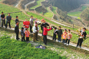 不一會兒,浩浩蕩蕩的娶親隊伍沿著田埂走過來了。看見路邊擺放的東西,他們就在衣服上面留下了糯米飯、雞肉之類的食物。