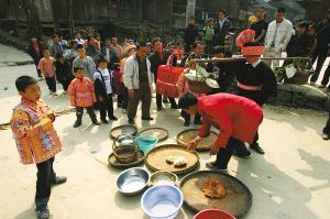 我們尾隨著娶親隊伍進(jìn)寨,發(fā)現(xiàn)寨子中間的路上也擺著很多簸箕、臉盆之類的容器,原來,村民們也要“討賞”呢!聽高邦寨的村支書說,遇到這種情況,路人放的東西越貴重,娶親隊伍留下的肉食就越豐盛,有時甚至?xí)畔乱徽浑u或鴨呢!