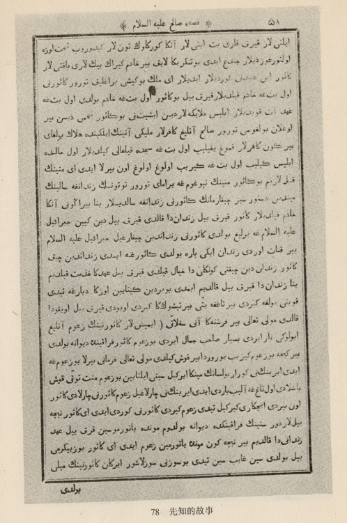 察合臺文著作。1899年喀山大學(xué)鉛印本。高25.5厘米,寬17.5厘米,共510頁。作者拉布古孜,寫于14世紀。圖為《先知薩立哈故事》中的一頁。寫的是異教徒們在魔鬼的支使下將要成為先知薩立哈的父親卡斯瓦爾關(guān)進地牢,天使奉真主之命使他逃出后與妻子見面的故事?,F(xiàn)藏新疆博物館。該書語言豐富生動,屬哈喀尼耶語(后期回鶻語)和察合臺語之間的過渡語言,一定程度上反映了當時的口語,是研究維吾爾語言史和文學(xué)史的重要資料。