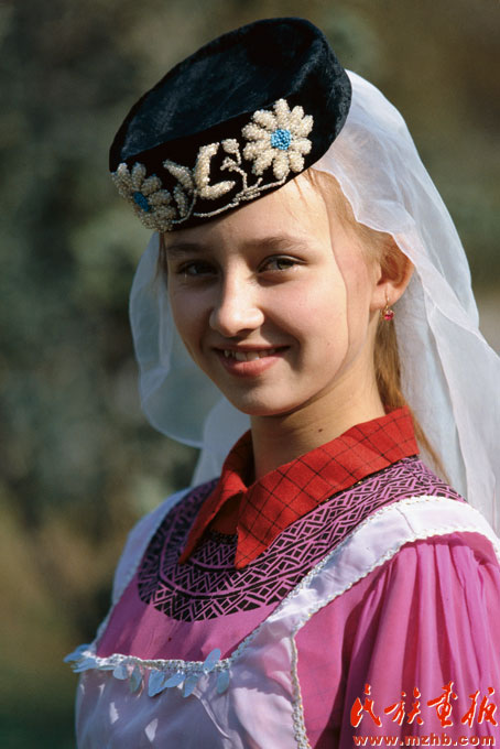 頭戴白色紗巾的塔塔爾族女孩
