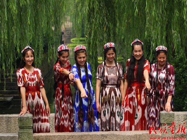 如果說苗族服飾是苗族的一部“無字史書”的話,那新疆維吾爾族的艾德萊斯綢和小花帽則是維吾爾族熱情奔放性格的集中體現(xiàn)。艾德萊斯綢質(zhì)地柔軟,輕盈飄逸,非常適合縫制夏裝。按顏色分為黑艾德萊斯、紅艾德萊斯、黃艾德萊斯和多色艾德萊斯。紅艾德萊斯綢圖案為紅色,底色用黃色或白色,富于青春氣息,深受姑娘和少婦的喜愛。黃艾德萊斯綢圖案為黃色,在各種底色的襯托下顯得莊重而典雅,顯示一種富貴氣息,一般在制成中青年婦女服裝的時(shí)候使用。綠艾德萊斯綢多用來縫制學(xué)齡前兒童的女裝。維吾爾族無論男女老幼,不分春夏秋冬,都喜歡戴一種維吾爾族語稱為“朵巴”的小花帽,制作小花帽運(yùn)用絲線平繡、絲線結(jié)繡、串珠片繡、格子架繡、盤金銀繡、十字花繡、鉤花刺繡、扎絨刺繡以及刺、扎、串、盤等技法,將花卉果實(shí)等圖案匯集在帽子中,使小花帽的顏色豐富多彩。