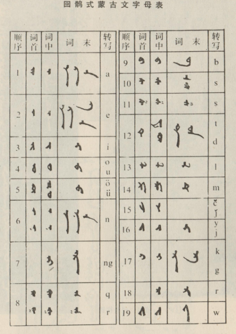 回鶻式蒙古文是一種拼音文字,字母分表示元音和表示輔音的兩大類。書寫時元音字母和輔音字母結(jié)合得很緊,筆畫連在一起,一氣呵成。最小的書寫單位是詞。但早期拼寫法不甚嚴密,有一個詞分做兩段書寫的情況。書寫格式是從上往下豎寫,從左往右移行?;佞X式蒙古文字母在詞首、詞中、詞末等不同位置上筆畫略有變化,以適應(yīng)連寫的需要。