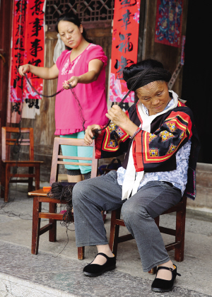 梳盛裝發(fā)型時(shí),需要用到假發(fā)、毛線等輔助工具來(lái)補(bǔ)充發(fā)量,才能令整個(gè)發(fā)型豐滿有型。雖說(shuō)是假發(fā),也是用收集來(lái)的真發(fā)編制而成的。盤(pán)發(fā)過(guò)程中女兒王萬(wàn)就在一旁協(xié)助母親。其實(shí)王萬(wàn)這一輩人,已經(jīng)不會(huì)梳這種傳統(tǒng)的發(fā)型了。