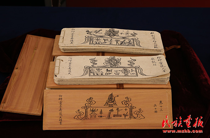 捐贈的部分東巴經(jīng)手抄本,經(jīng)書由納西族地區(qū)的35名東巴歷時29個月完成。經(jīng)書的卷名、題名及經(jīng)文提要漢文部分由納西族書法家許烈雄書寫,封面夾板的東巴文部分由納西族新一代東巴木琛書寫