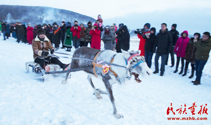 在呼倫貝爾冬季的冰雪風情節(jié)上,鄂溫克族的馴鹿拉著雪橇,吸引了許多游客的目光(武倩 攝影)